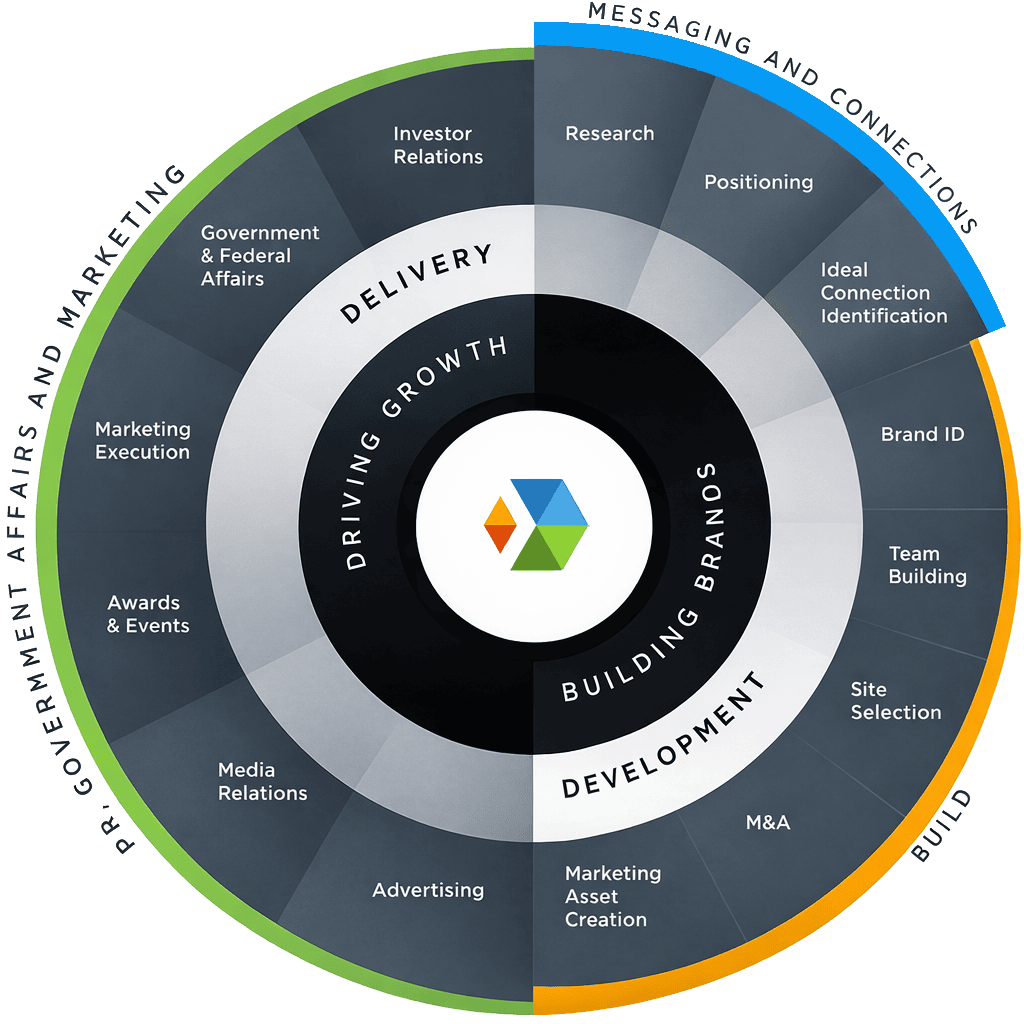 By truly understanding our client’s goals, key milestones, potential areas of risk, ideal customer and investor targets, partner profiles, and other key drivers, we create messaging and strategy that goes beyond traditional brand awareness to meet mission objectives. As a full service firm, we work across all the areas in the graphic.